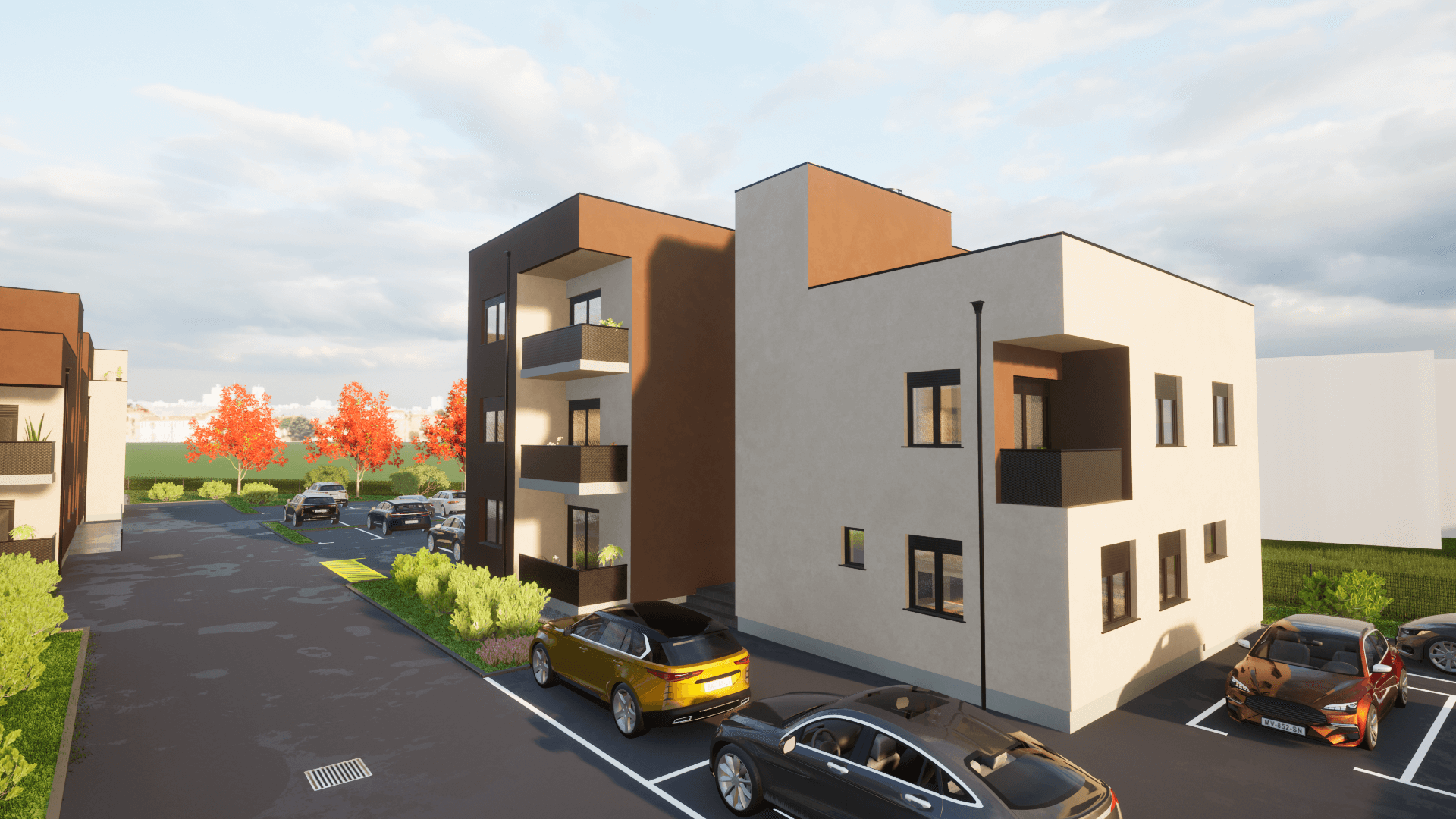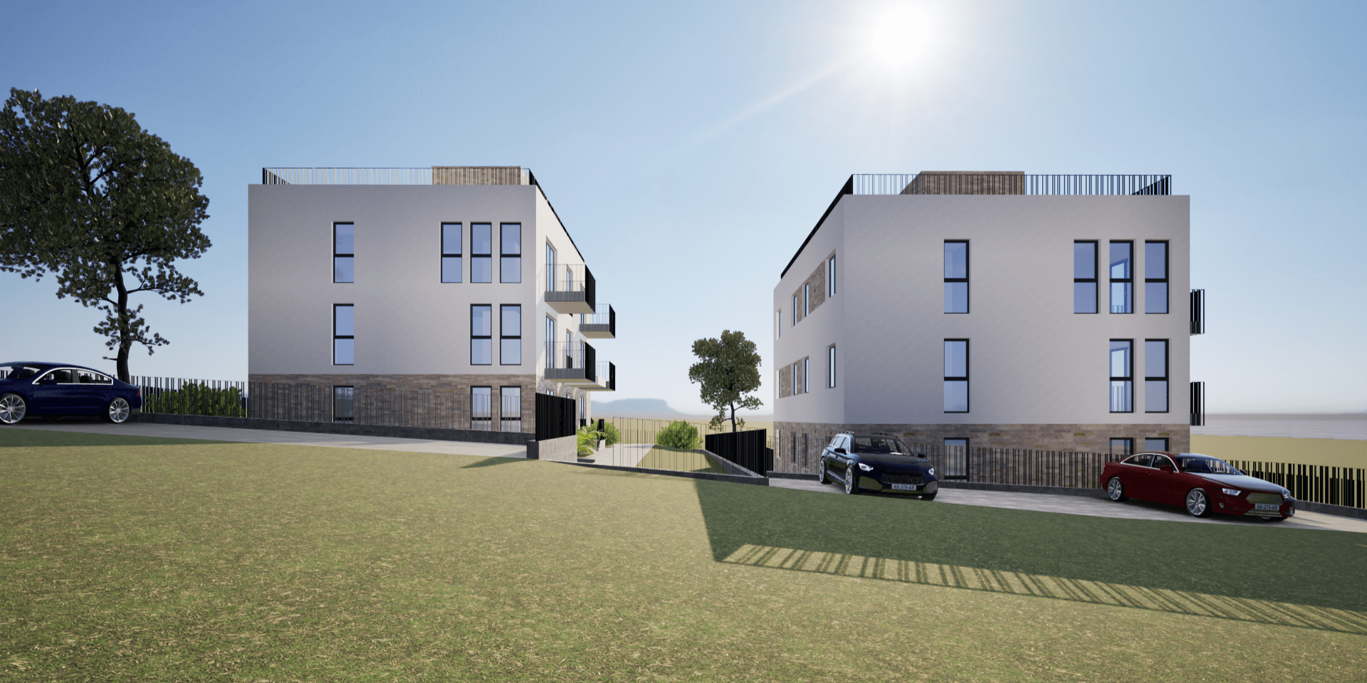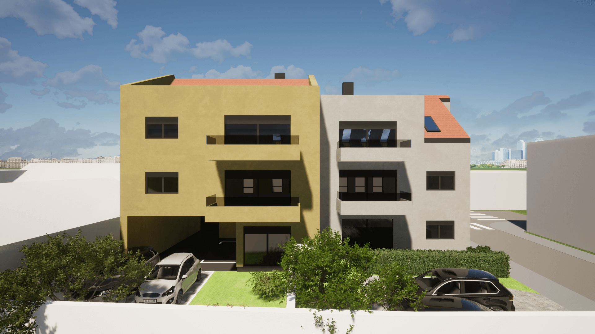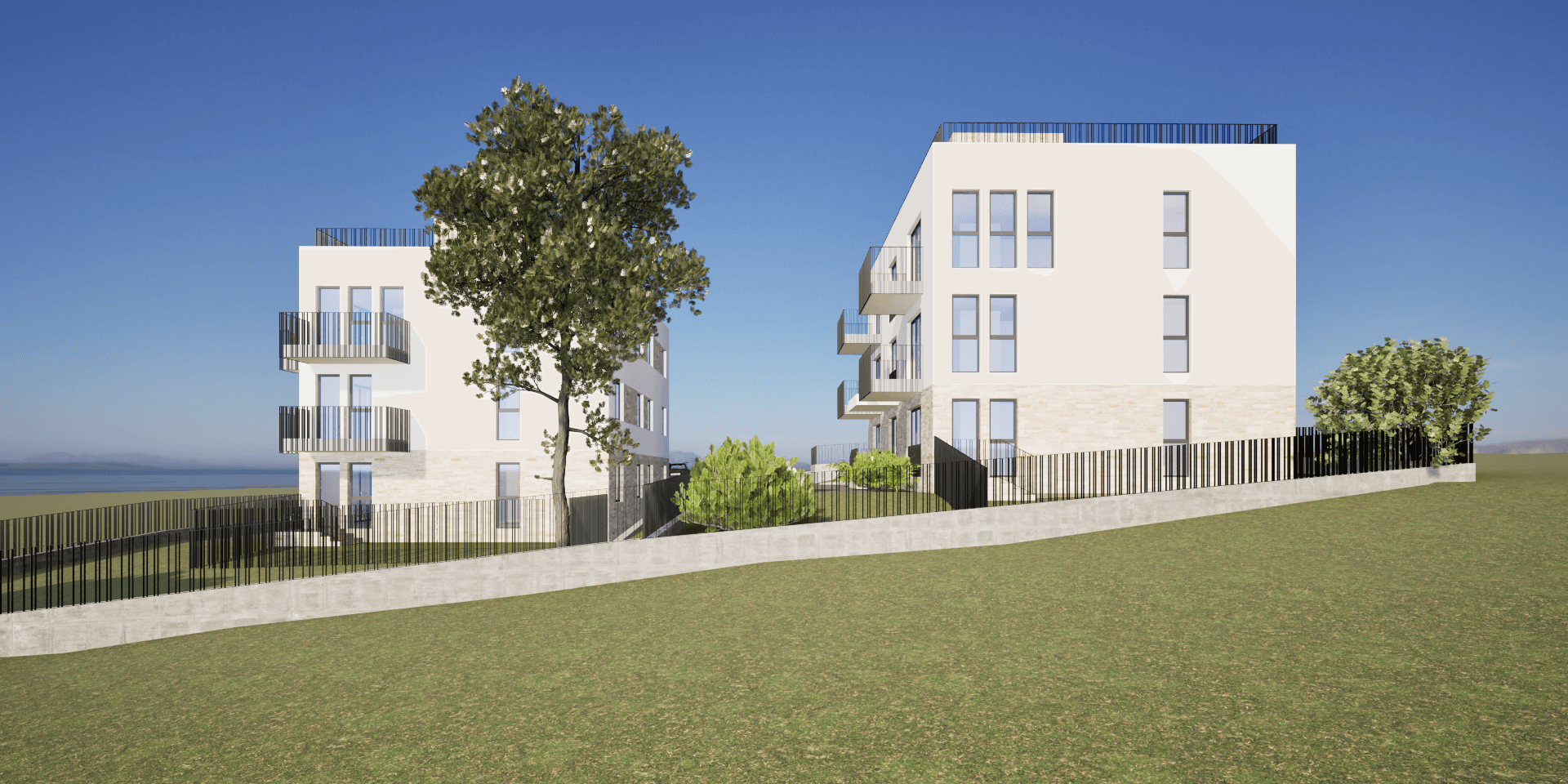 Dvije moderne stambene zgrade svaka zgrada s tri etaže i 6 stanova nudi funkcionalan raspored, privatnost i suvremeni dizajn. Prizemlje uključuje ulazni prostor i dva stana, dok se na gornjim katovima nalaze po dva stana. Krovna terasa pruža dodatni vanjski prostor za opuštanje i uživanje u pogledu.