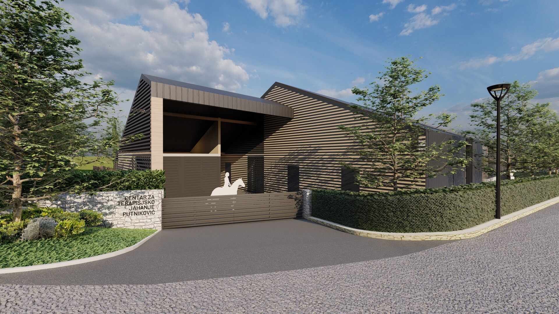 U prizemlju se nalazi zatvoreni i natkriveni prostor za hipoterapiju kao središnji dio zgrade. Sjeverno su smješteni prostori za povremeni poludnevni boravak terapijskih konja i prateći pomoćni sadržaji, dok se južno nalaze prostorije za različite terapije za djecu i osobe s teškoćama, višenamjenska dvorana te prostori udruge.